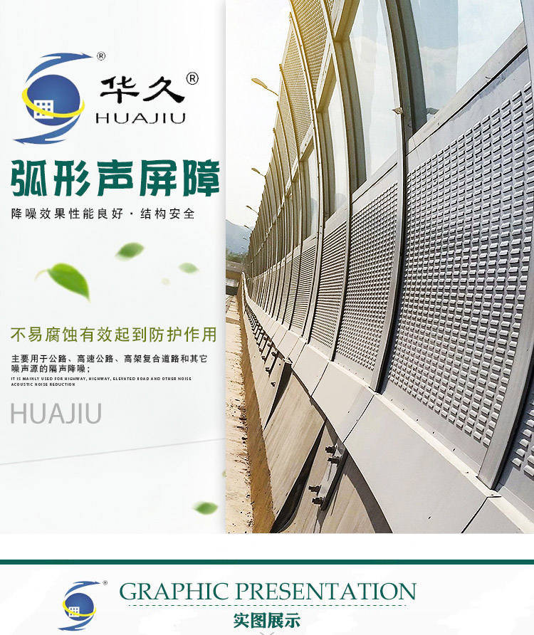 弧度型聲屏障結構設計的目的一般是使從屏障頂部繞射的衍射聲得到有效衰減?;《刃吐暺琳系脑O計目的是噪音污染聲源不僅是可以從頂部繞射出去,同時也可以從中間甚至中下聲音傳播時就可以將聲音繞射,聲音折射出去,從而將聲音降低。弧形聲屏障和頂部弧形隔音墻高強度的運用結合我國各地區不同的氣候條件,在結構設計時充分考慮風荷載。通過自動生產線,壓制凹槽以增加強度,使產品抗10-12級臺風,抗風壓300kg/㎡。